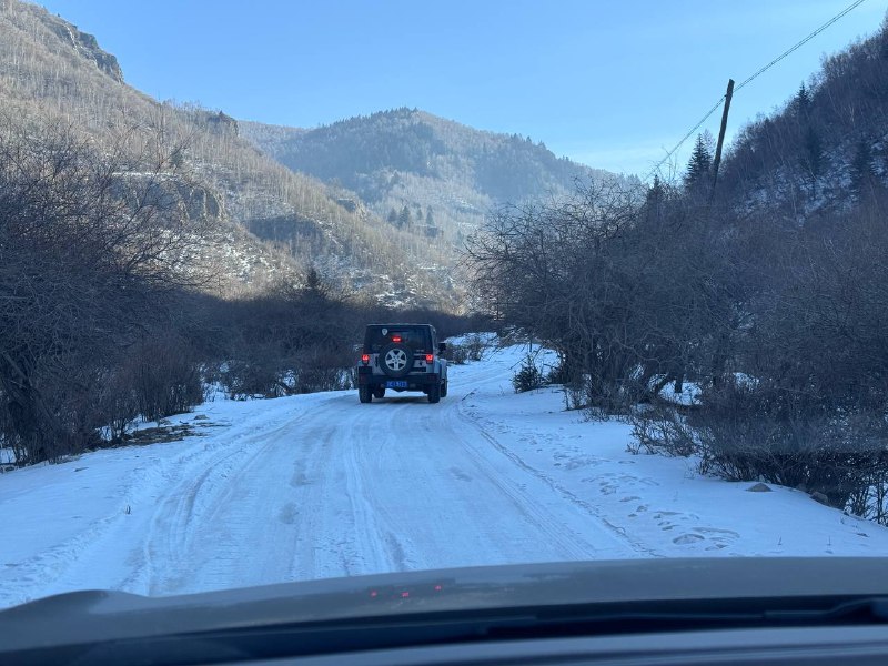 从木塔出来后,我们驱车前往传说中的万年冰洞。然而,由于山路积雪严重,我们的商务车无法前行。同行朋友的四驱车勉强到达景区,却发现由于冰雪封路,景区已关闭。